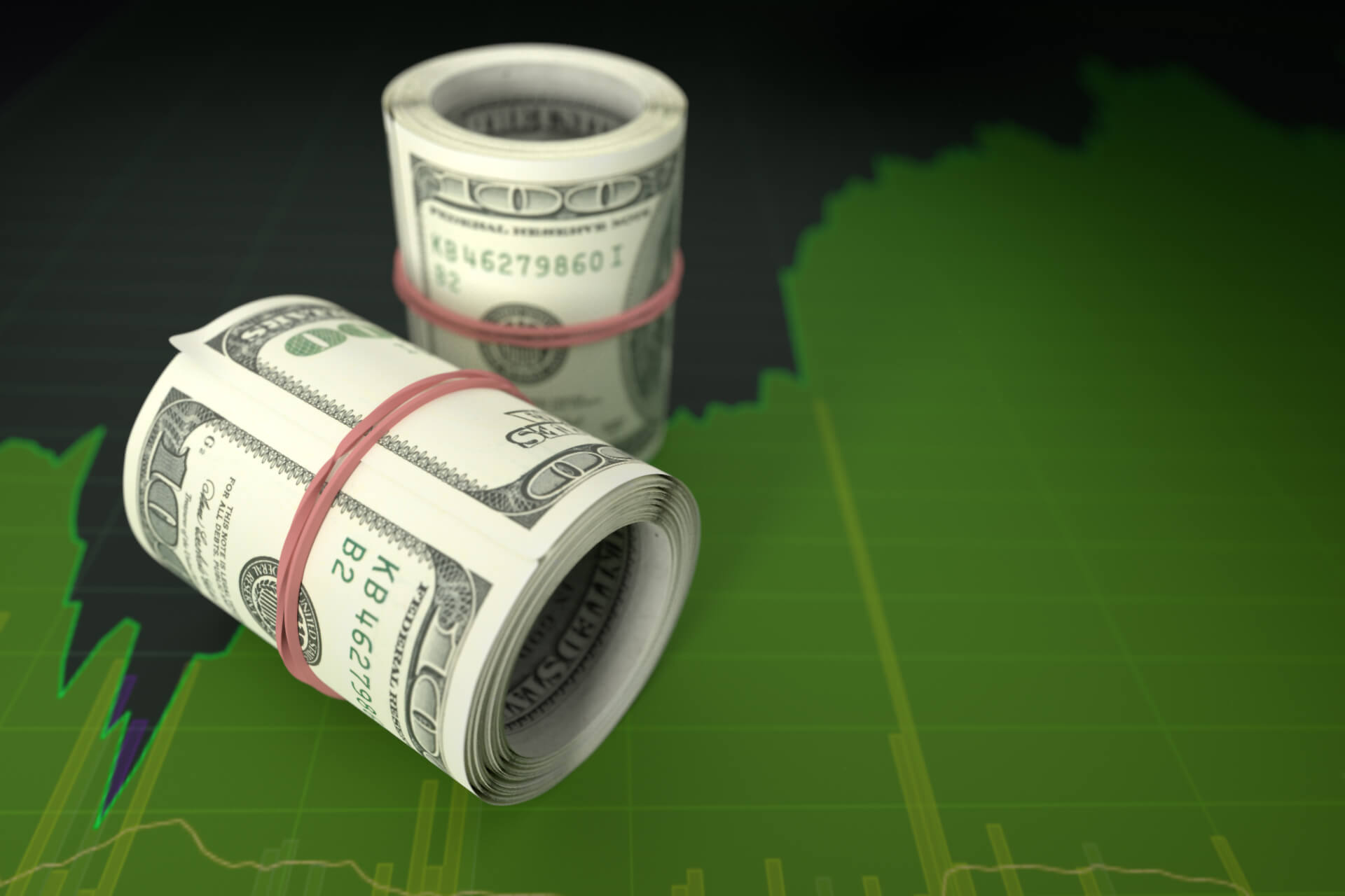 Two rolls of U.S. bills laying on top of bright green stock price area chart
