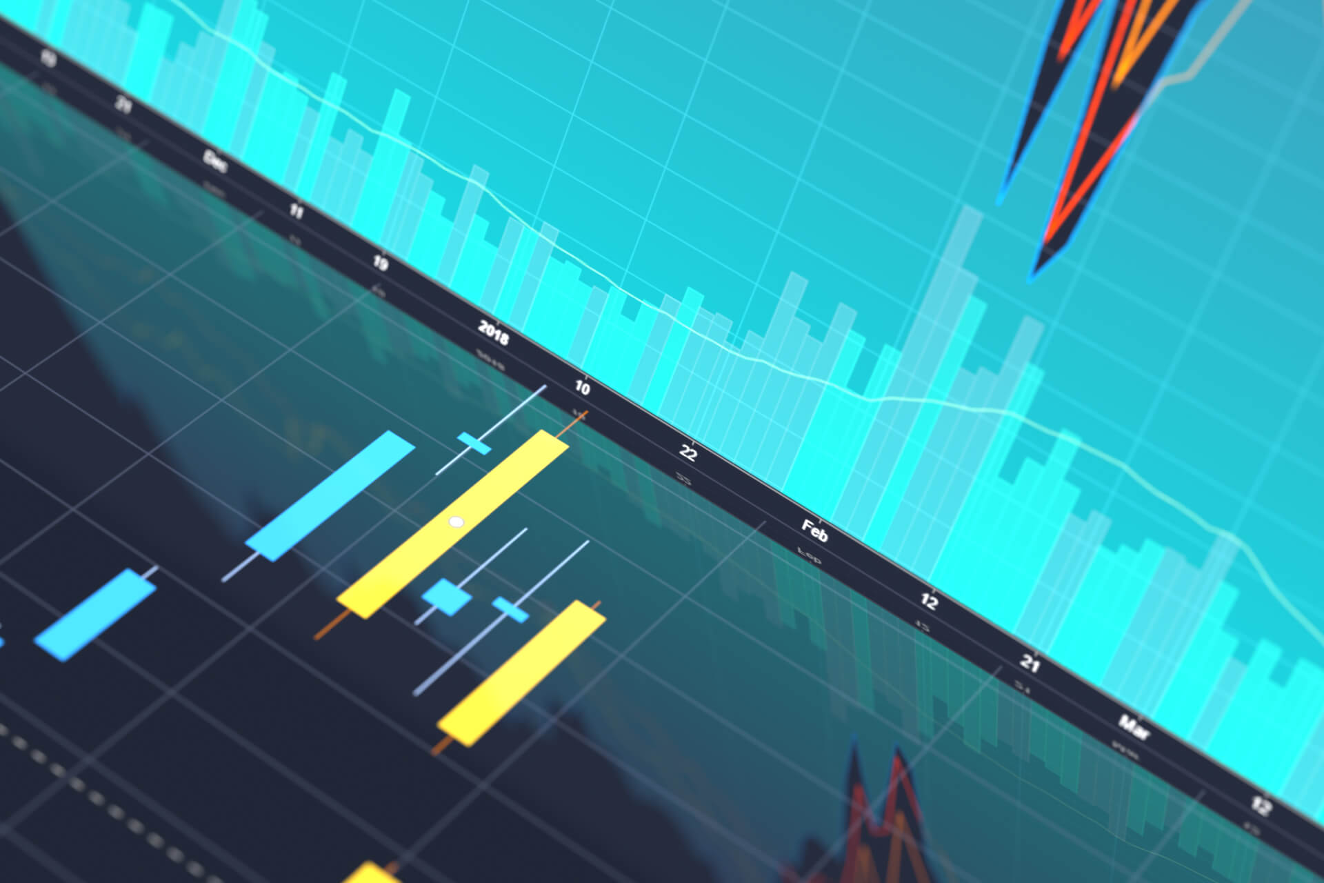 Stock price area chart and trading volume reflected in glossy candlestick chart