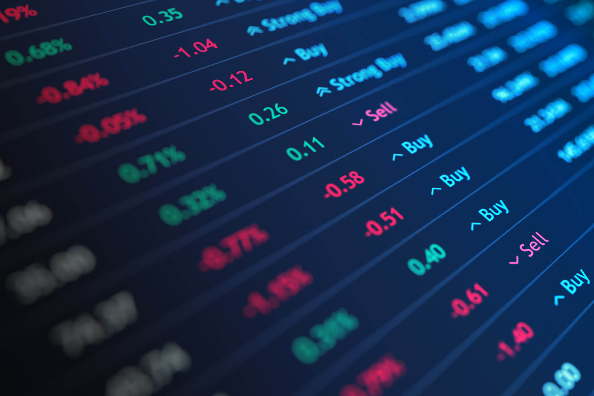 Stock exchange ticker listings at angle and perspective with light blue lighting