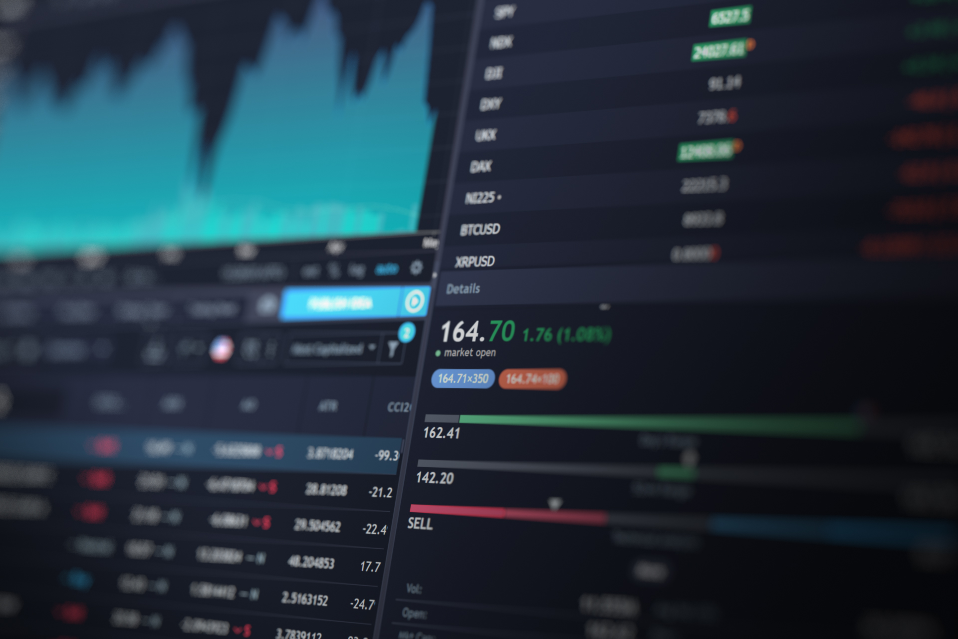 Computer screen showing stock data including price area chart, stock listings, and market capitalization