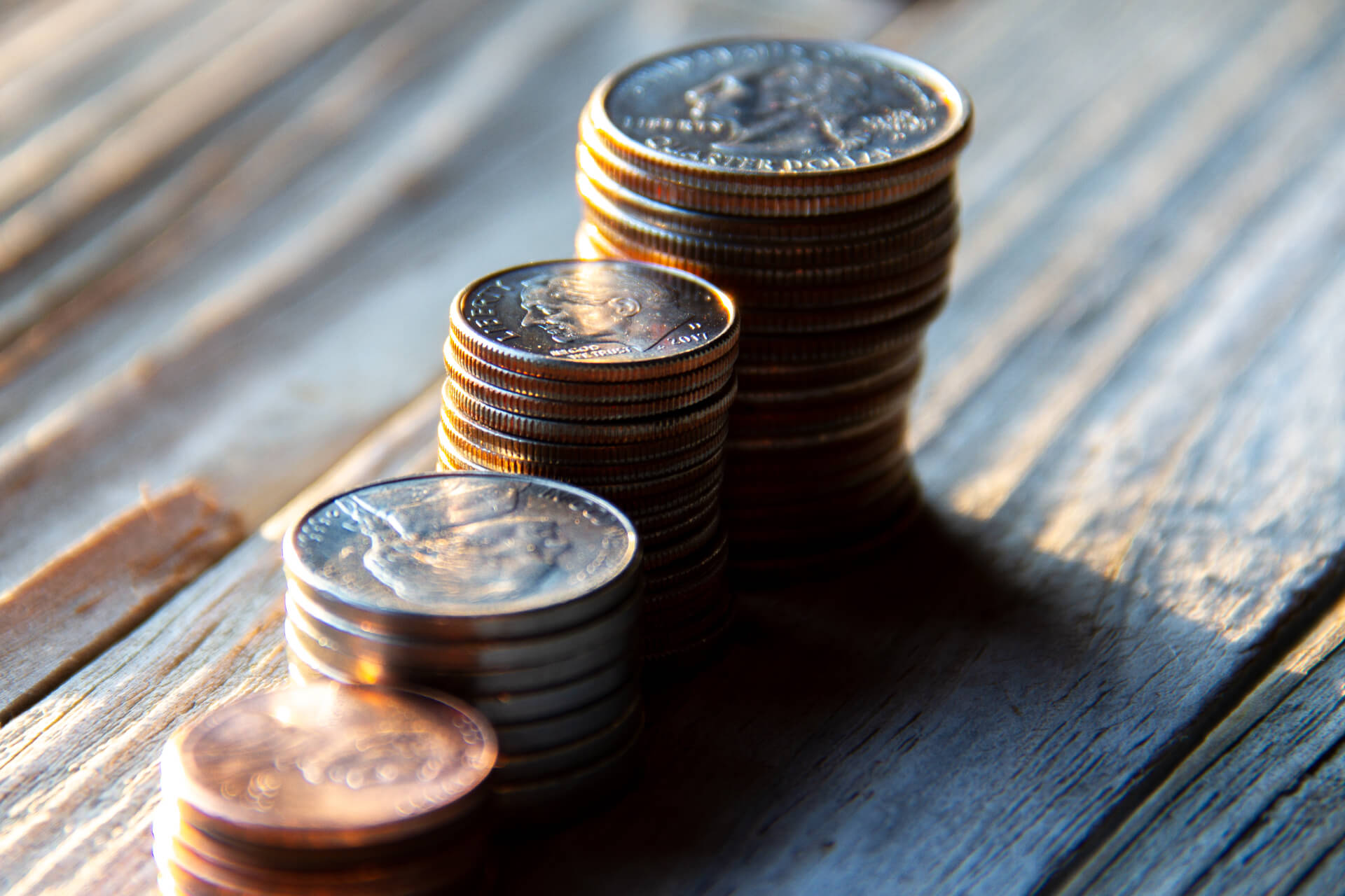 Increasing stacks of pennies, nickels, dimes, and quarters like chart in morning light