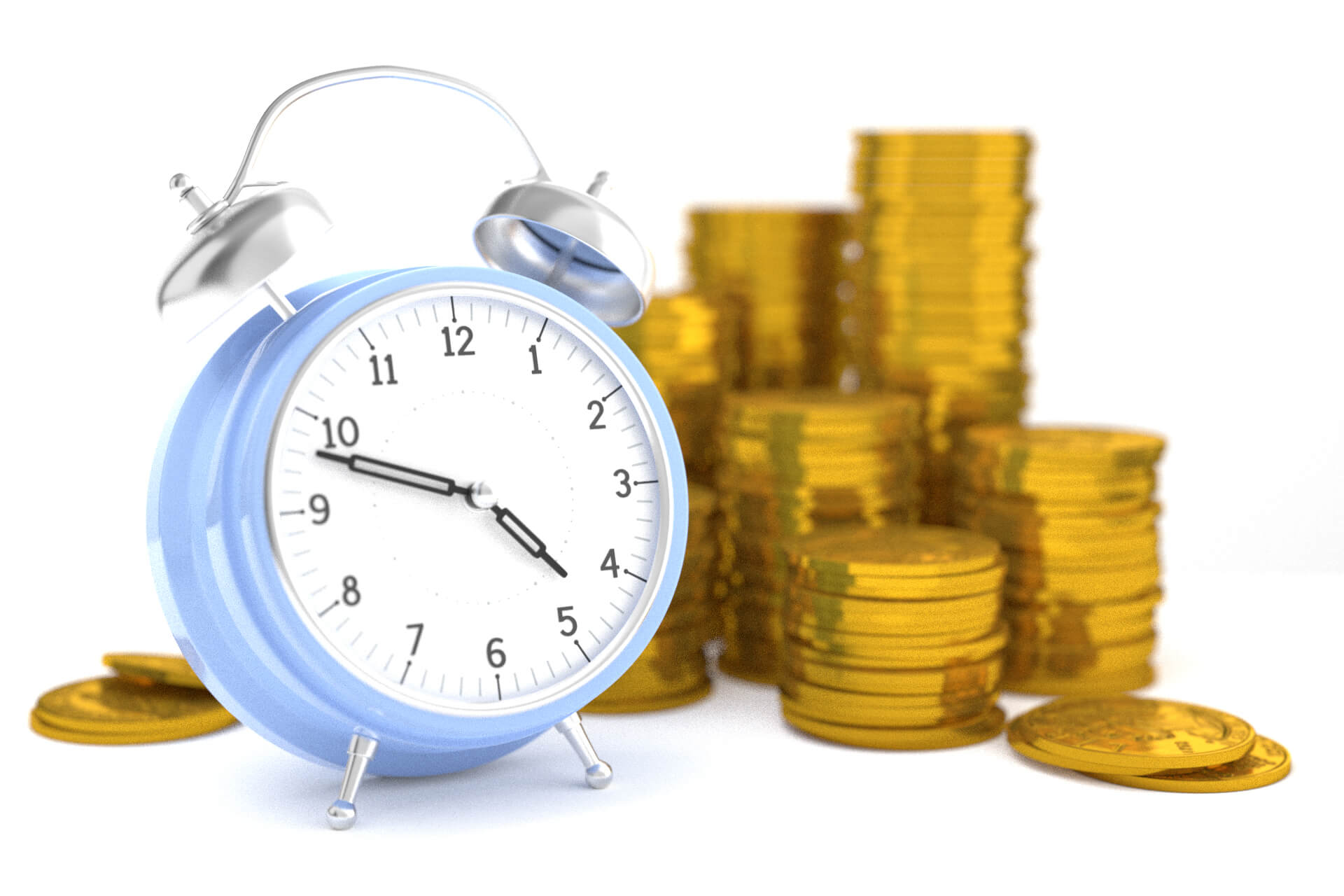 Clock with stacks of gold coins isolated on white background concept for time is money, retirement, or compound interest