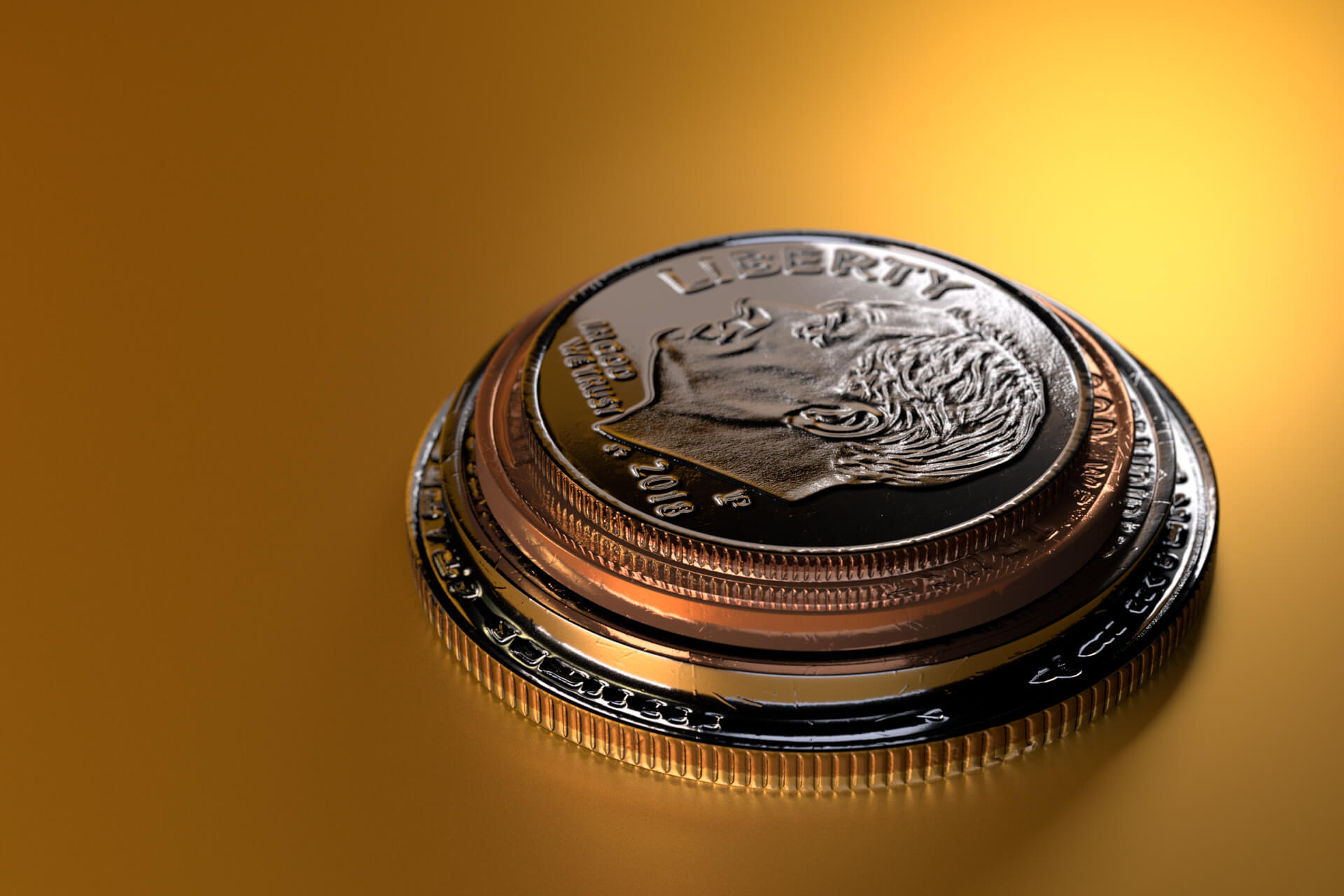 U.S. coins stacked on gold background with strong spotlight