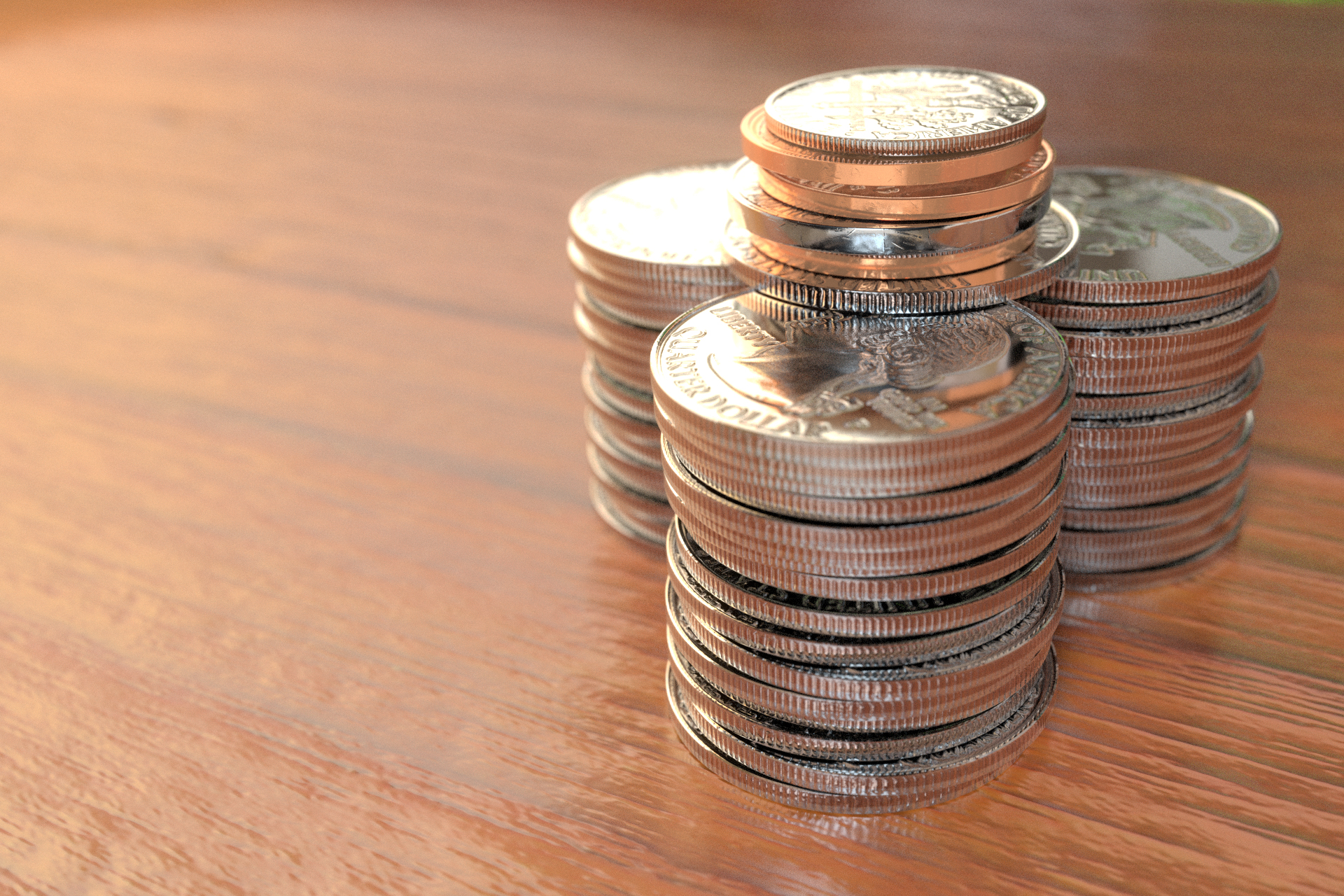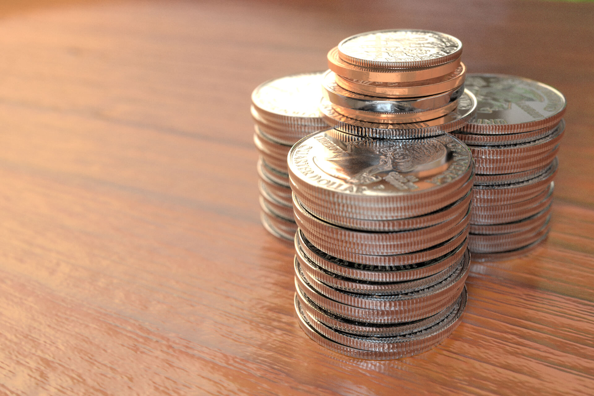 Three large stacks of shiny quarters with other smaller coins on top with rich wood surface