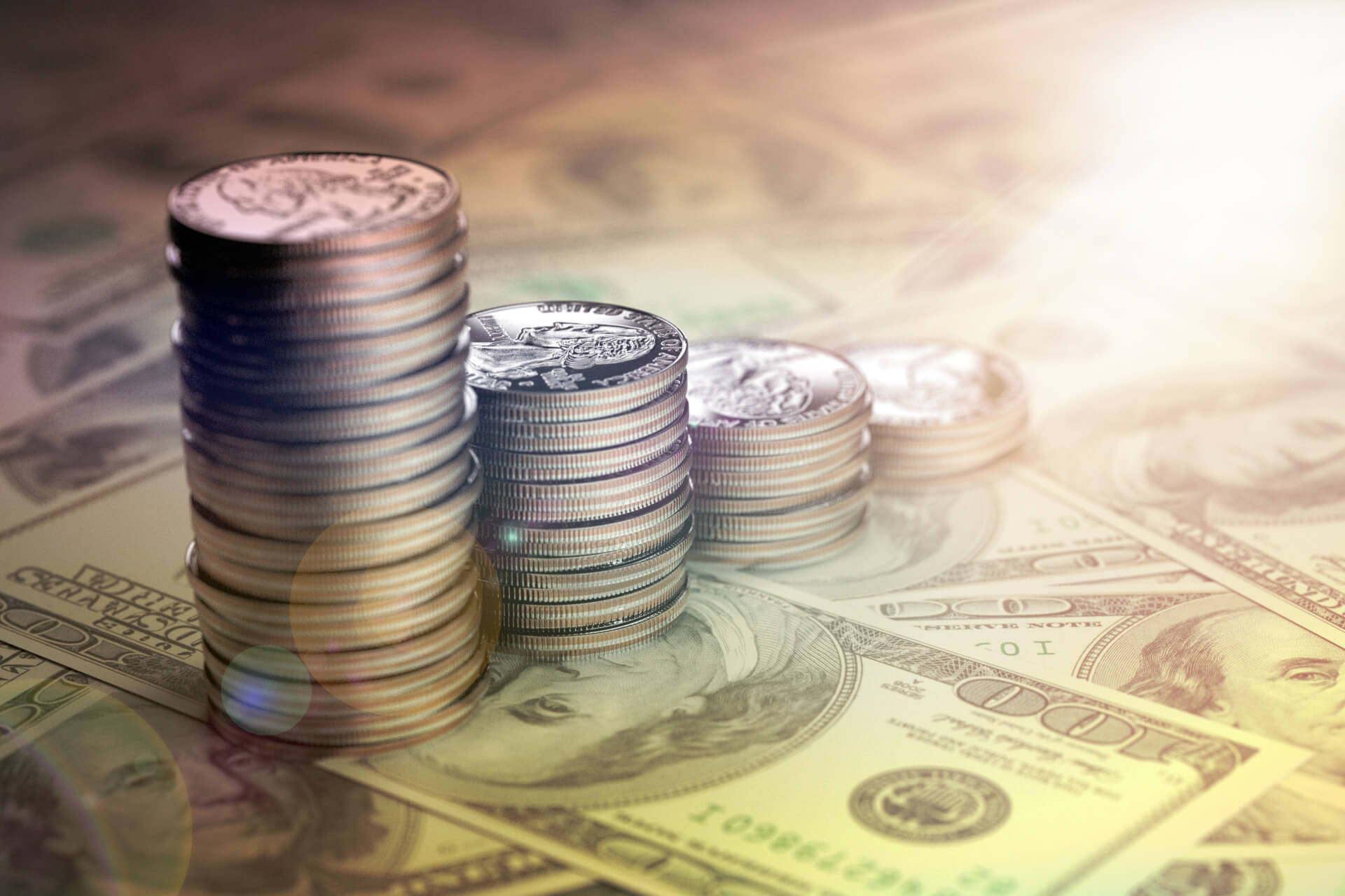 U.S. quarters stacked from large to small on top of one hundred dollar bills with lens flare and overlay
