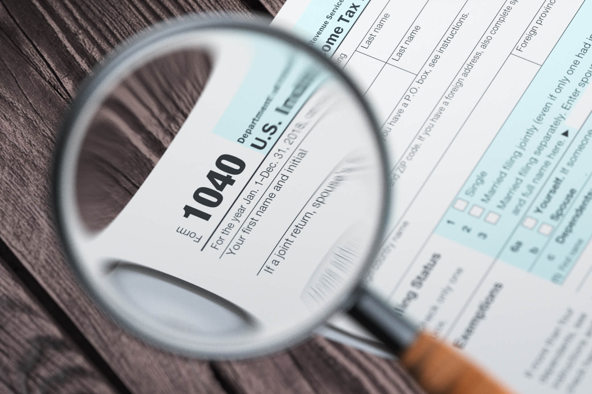 IRS form 1040 magnified in magnifying glass on wood plank background