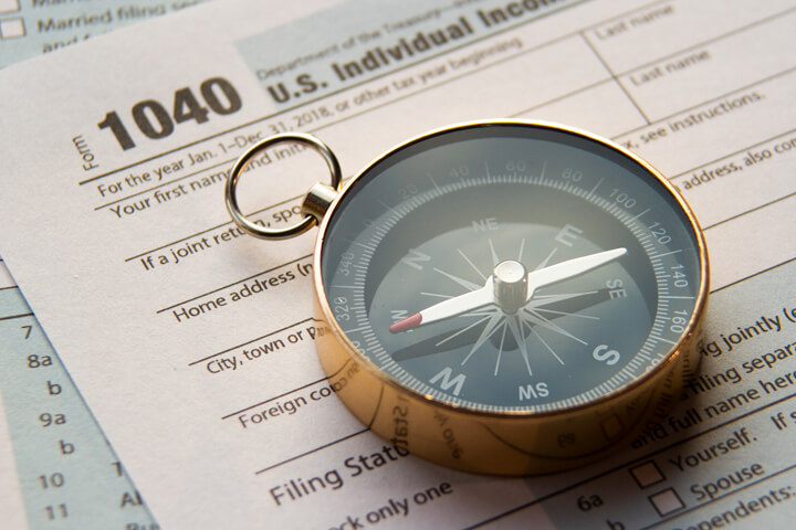 Tax help concept photo showing IRS form 1040 with navigational compass