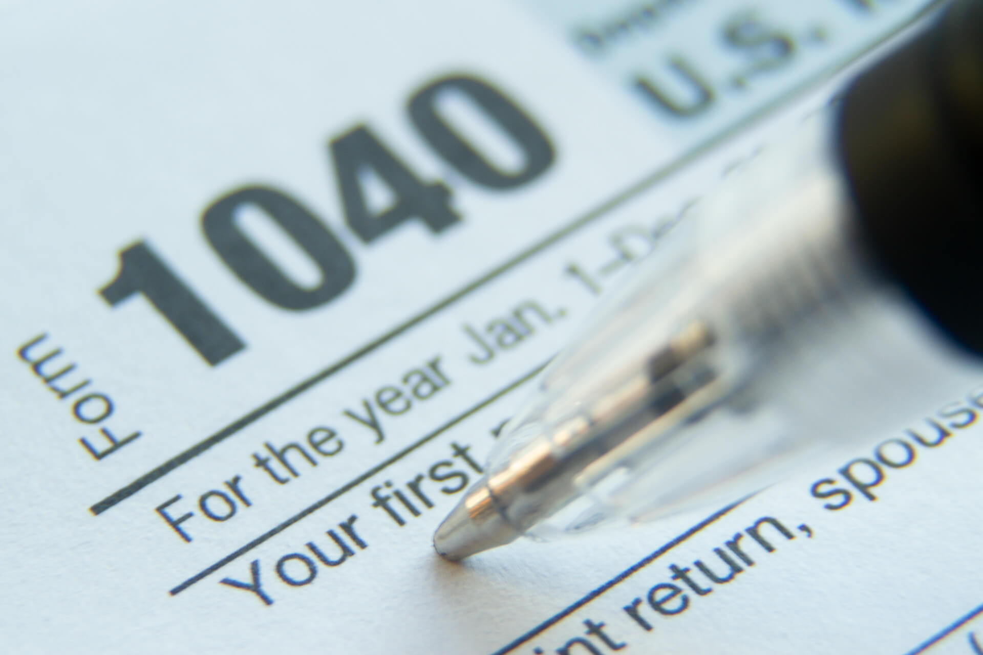Extreme close up photo of tip of pen in the first name field of IRS 1040 tax form
