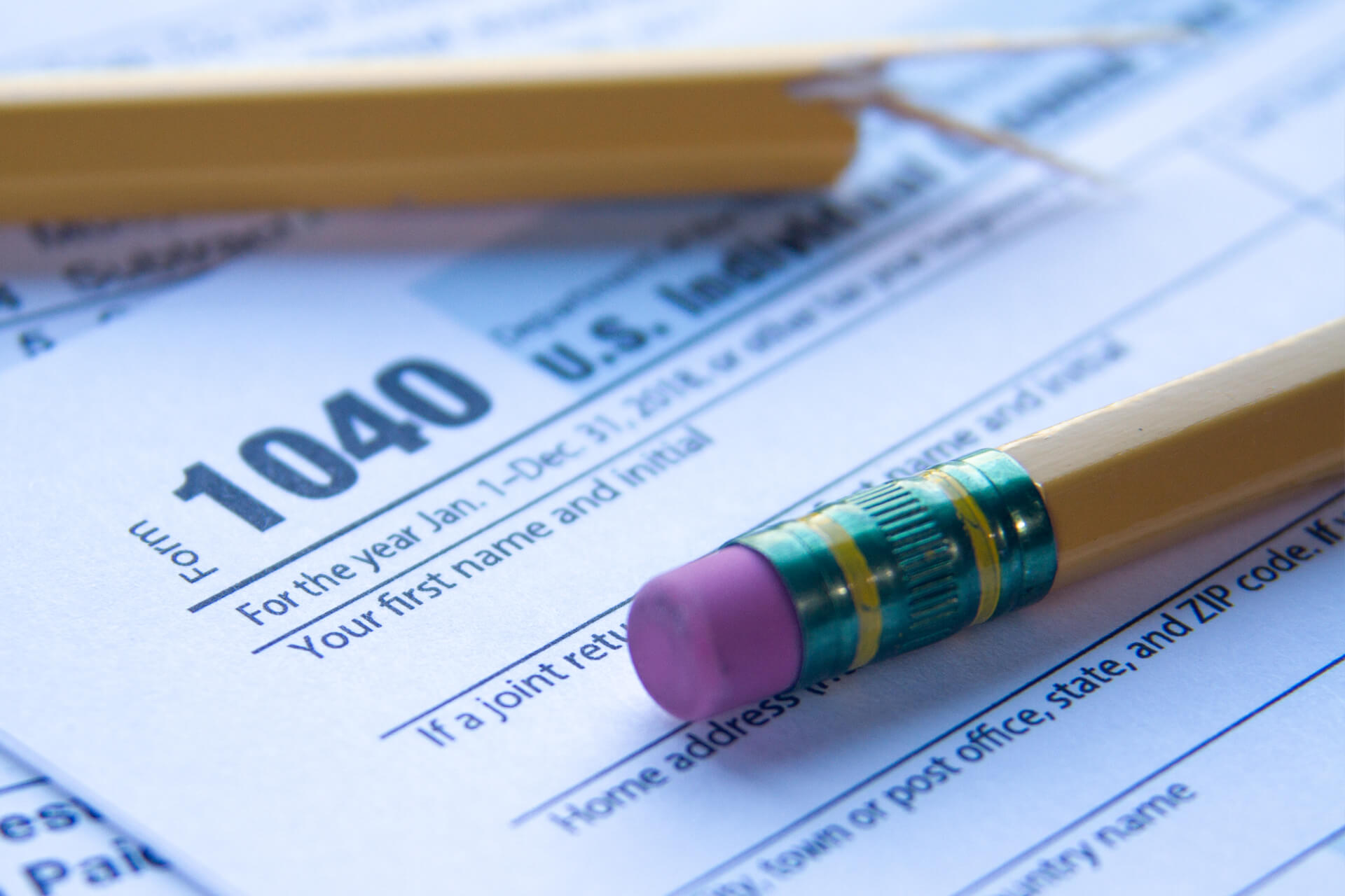 Sunlight photo of IRS form 1040 with broken pencil concept for tax time frustrations