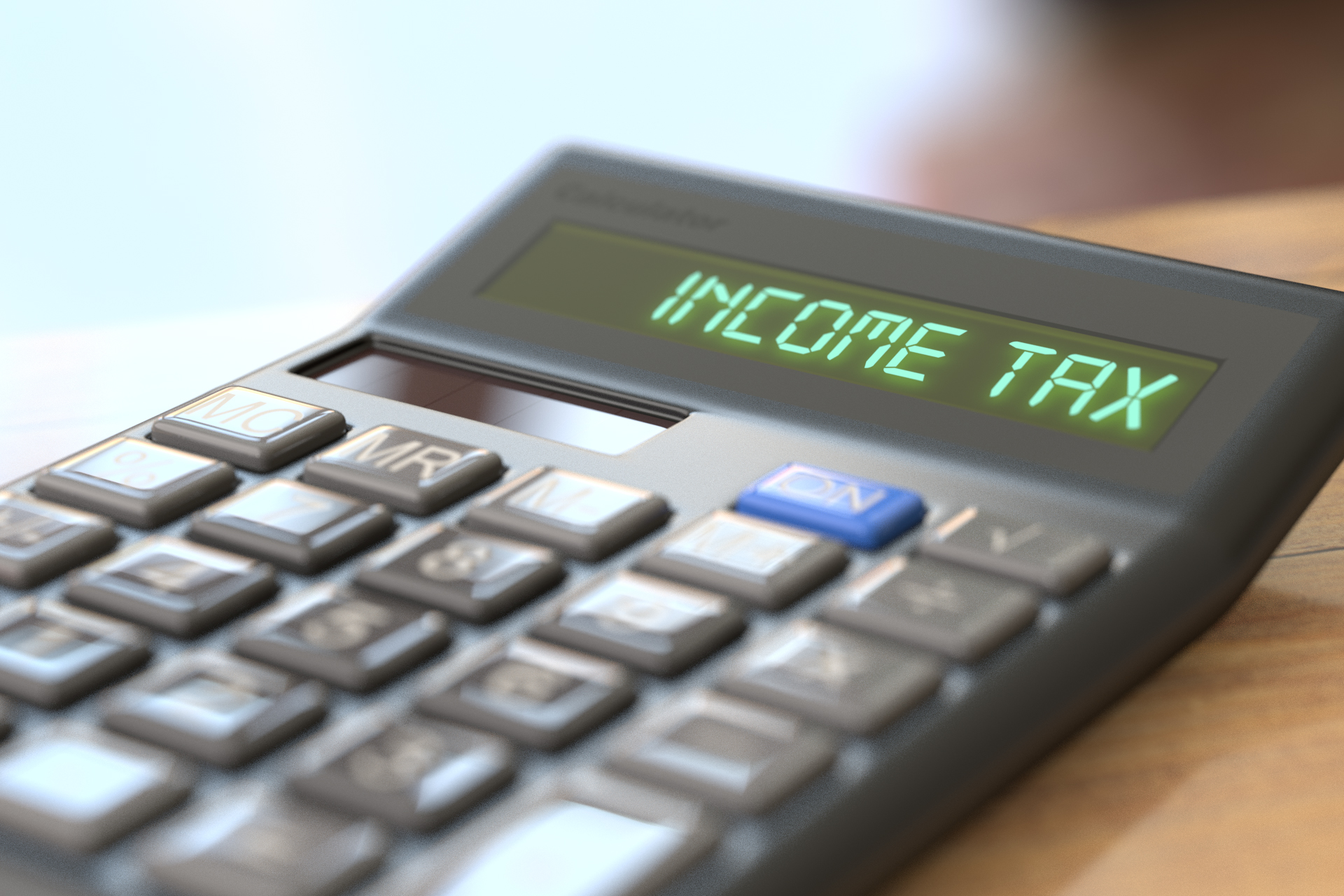 Tax concept image of a calculator with LCD reading Income Tax