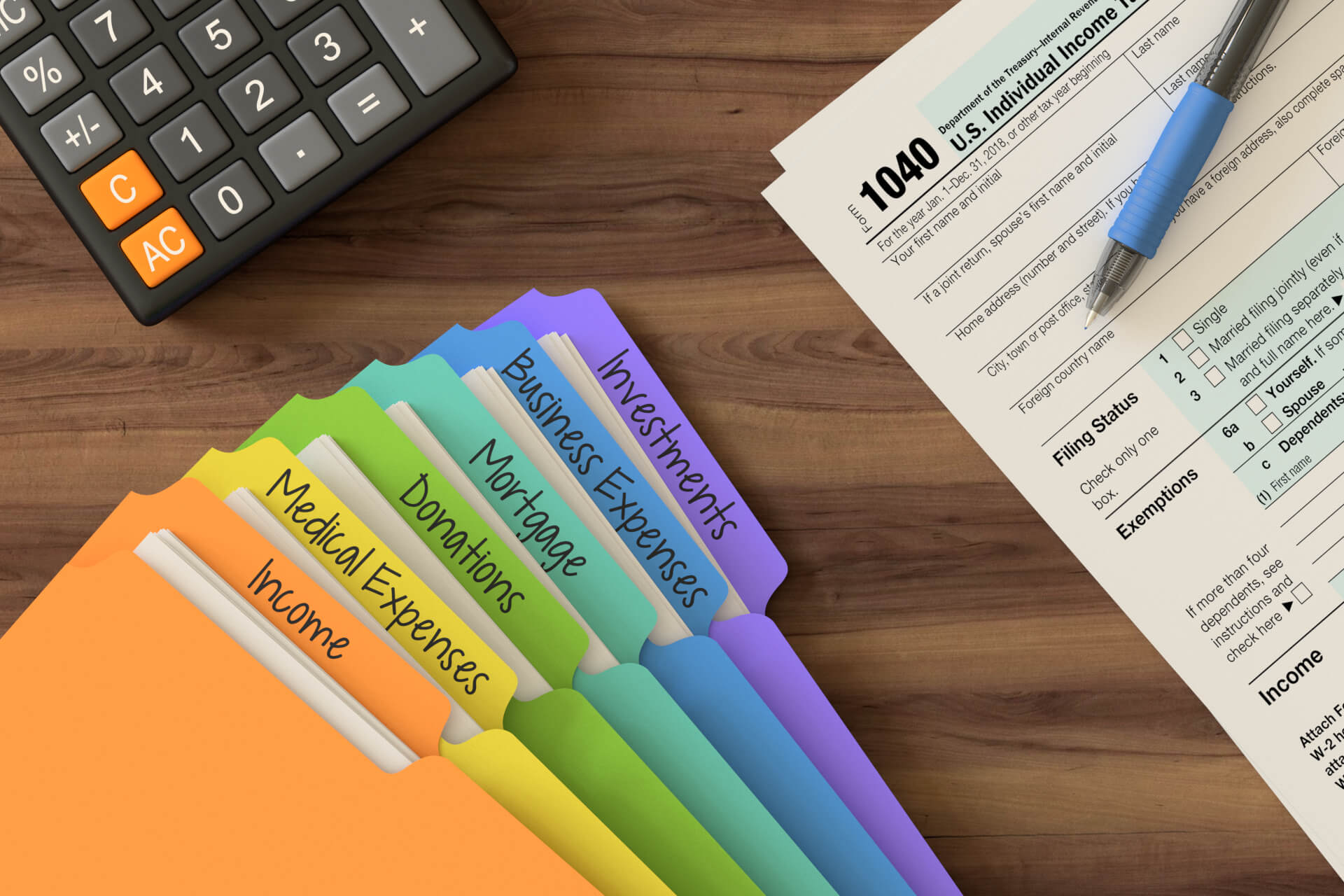 Desktop overhead view showing calculator, tax folders, and IRS form 1040