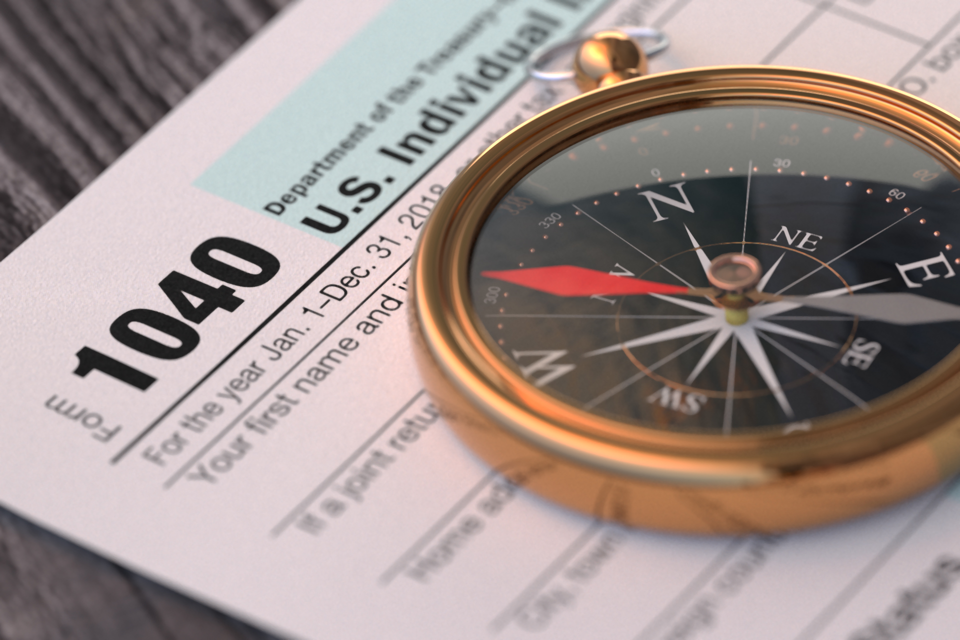 IRS form 1040 on wood background with navigation compass concept for tax help, direction, or advice