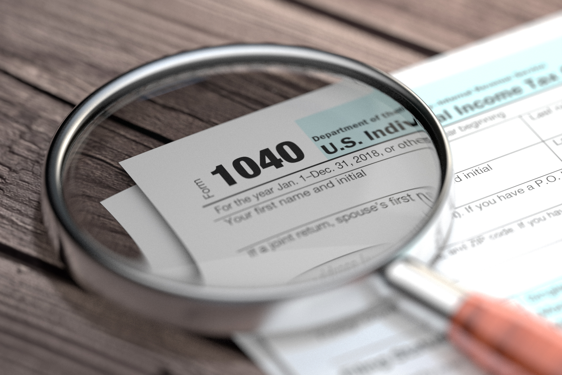 IRS form 1040 lying on worn wood planks with magnifying glass focused on Form 1040 paperwork text