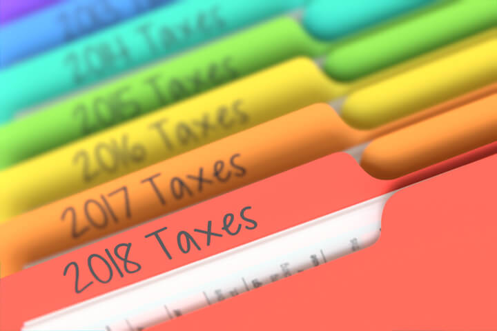 Photo of prior tax year rainbow-colored manila folder tabs in filing cabinet
