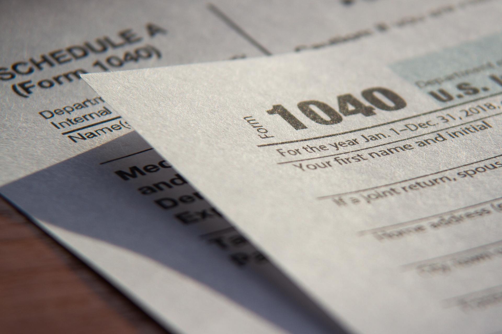 Photo of IRS 1040 tax form lying on top of Schedule A form with hard shadow