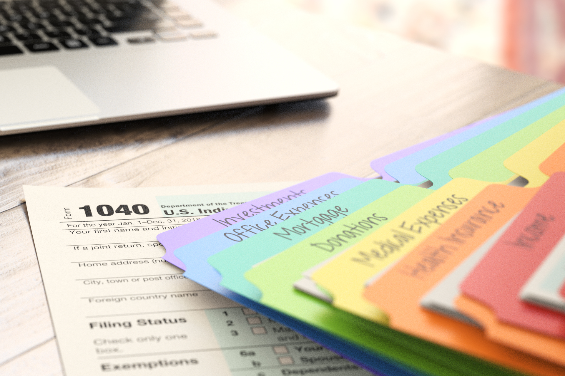 Desktop with laptop, 1040 tax form, and rainbow-colored manila tax folders