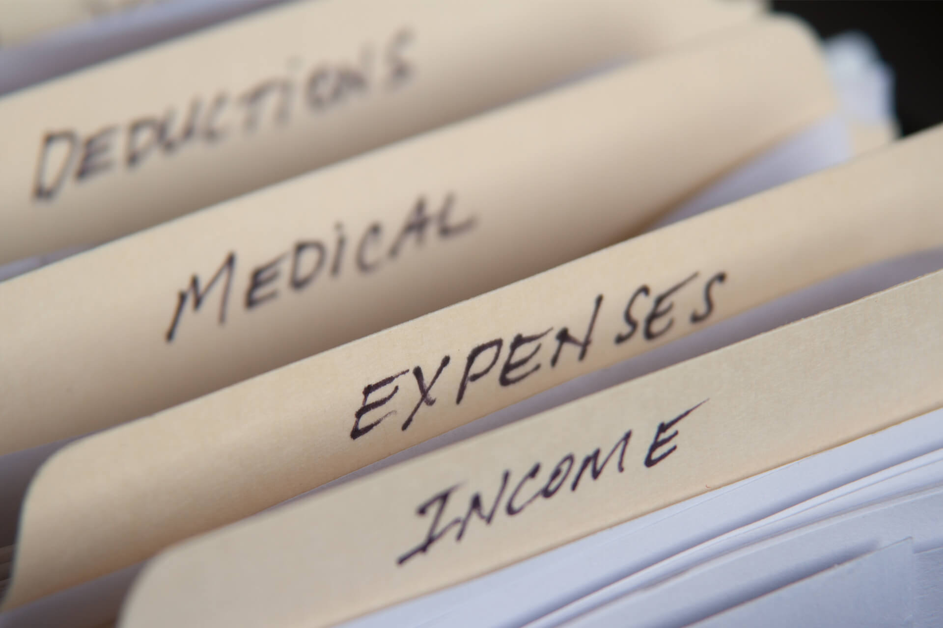 Manila filing folders with tax income, expenses, medical, and deductions and camera depth of field