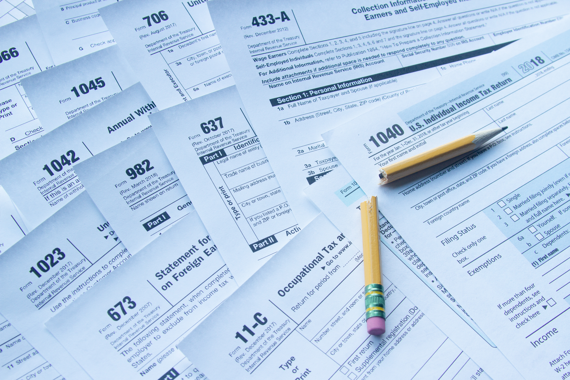 Broken pencil lying on many IRS tax forms concept for tax filing frustration or confusion