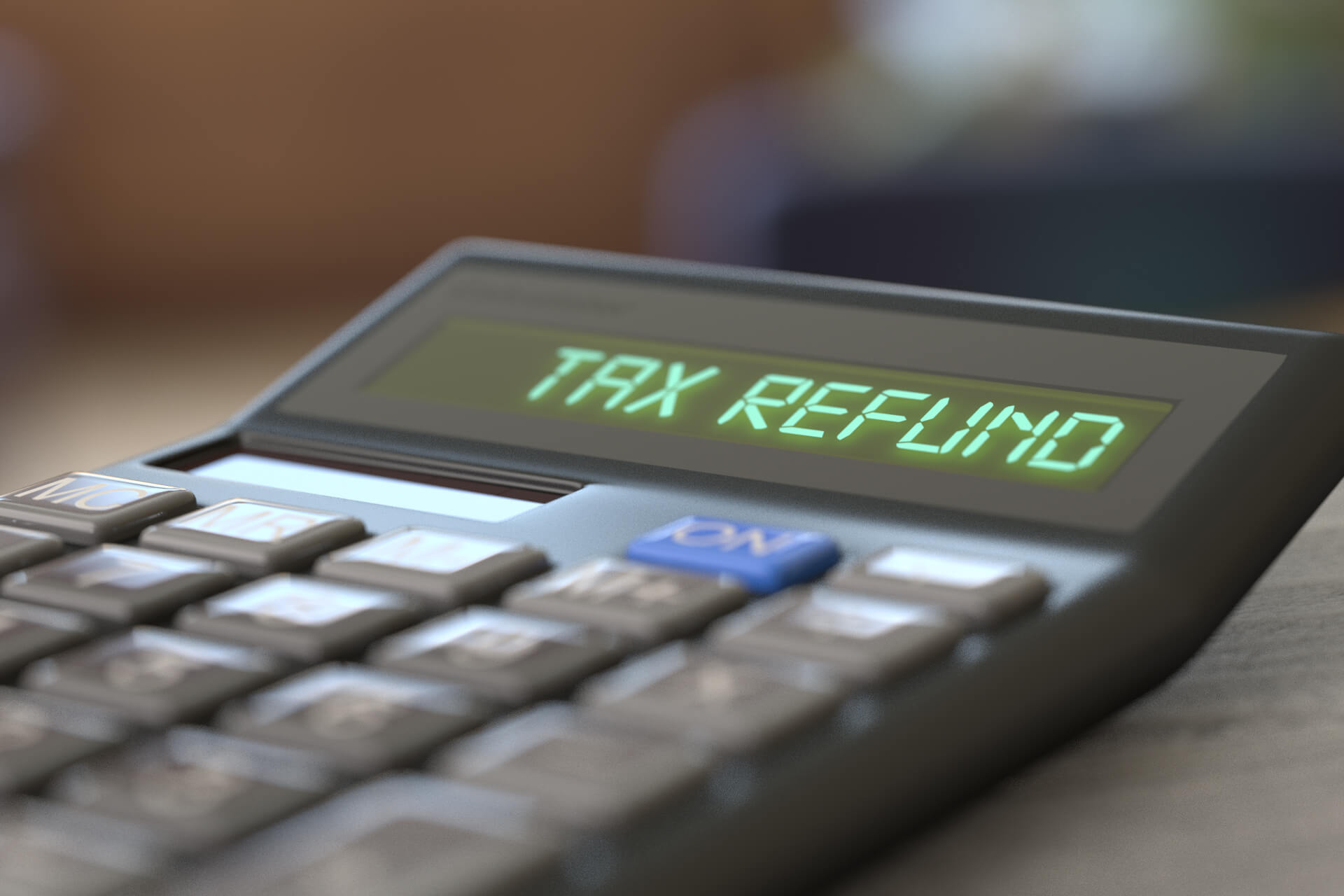 Calculator with LCD reading Tax Refund with nice interior bokeh background