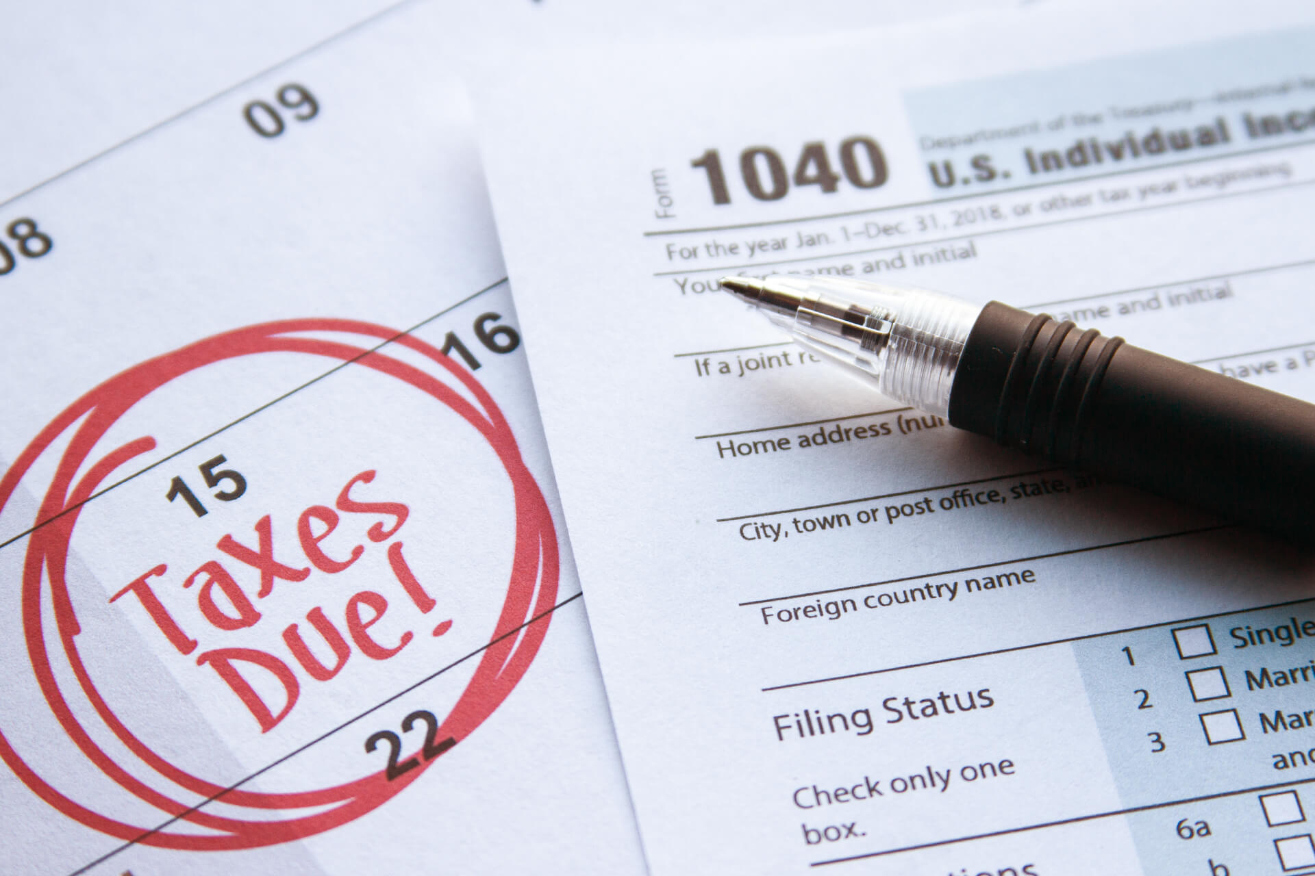 Calendar page with 15 circled and taxes due in red marker with 1040 form on top
