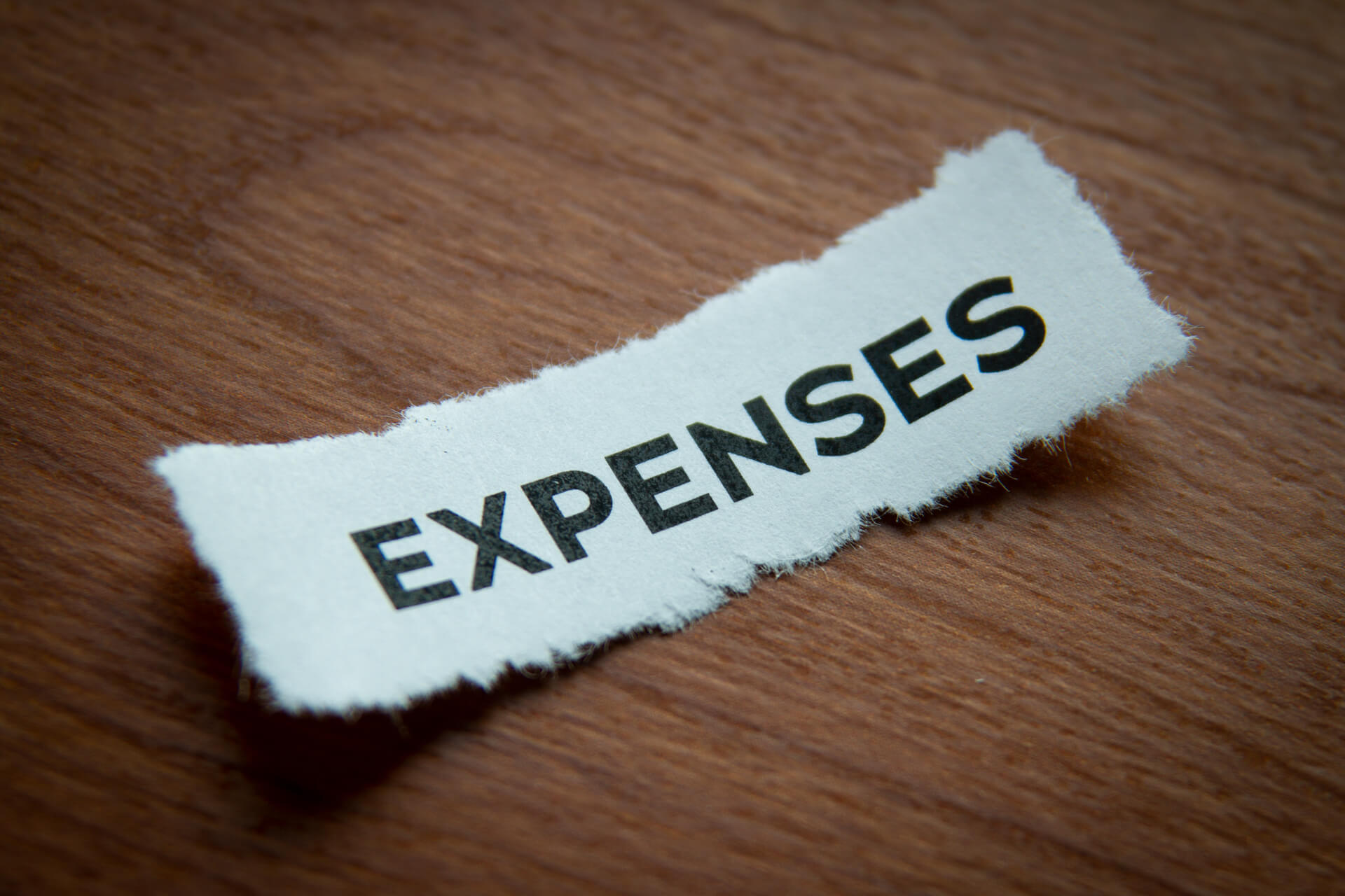 Torn piece of paper with word Expenses with depth of field blur and woodgrain background