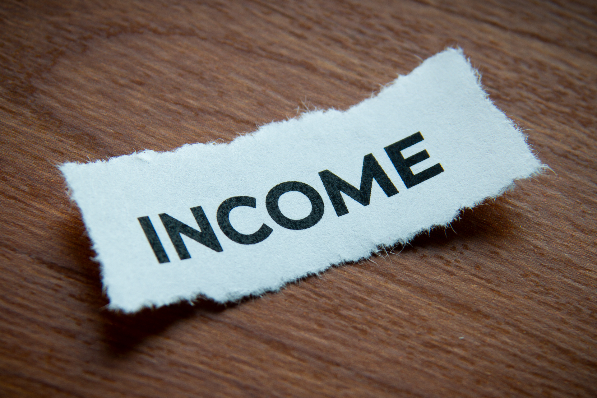 Torn piece of paper with word Income on depth of field and vignette on wood surface