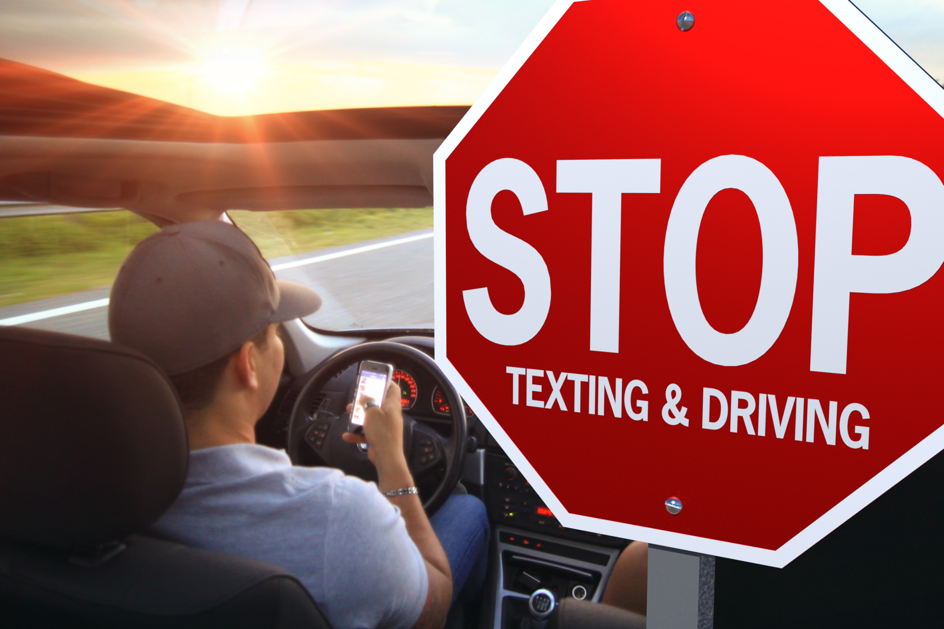 Man driving into sunset texting on cell phone with stop texting and driving stop sign