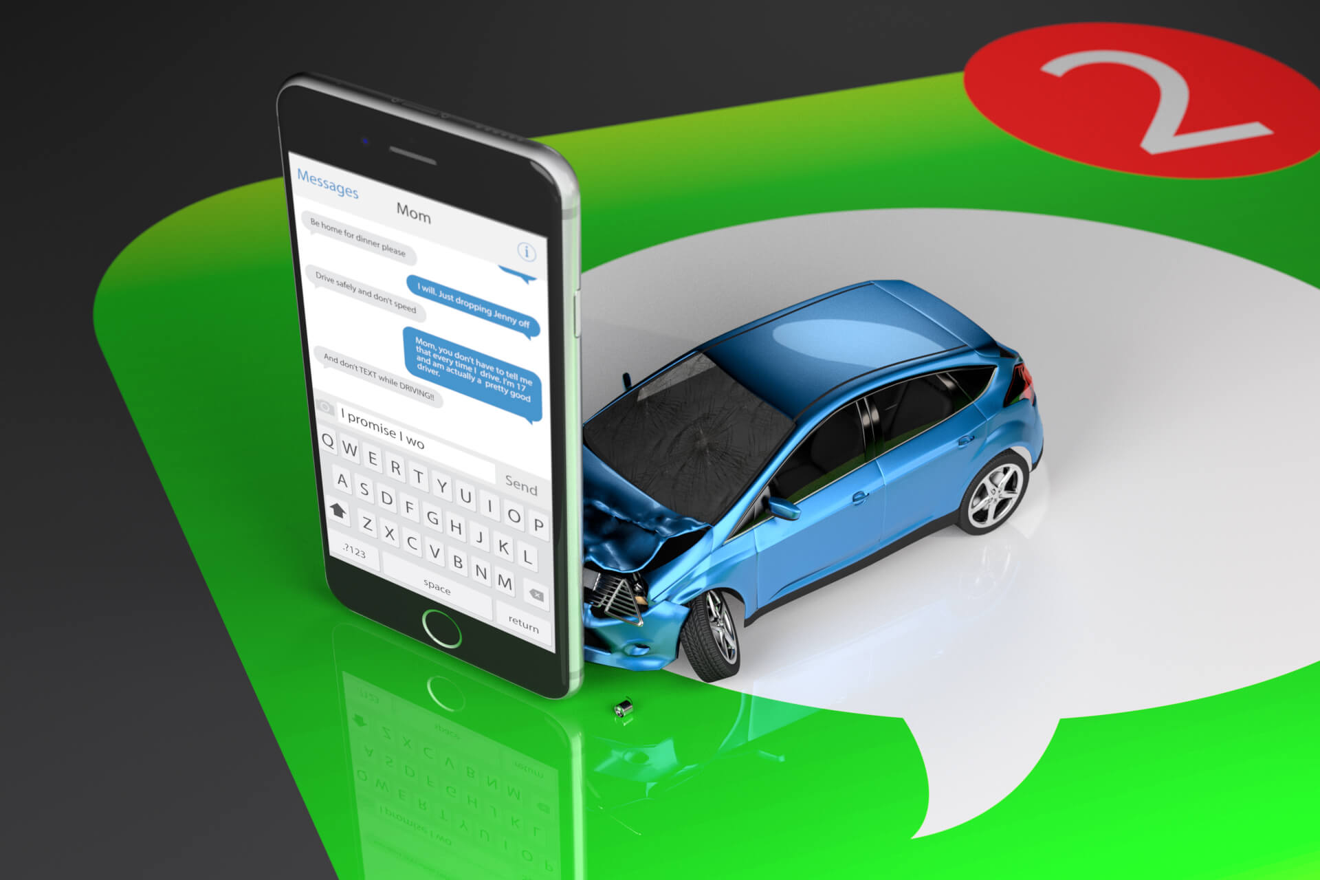 Car crashed into upright cell phone with texting screen on top of large message app icon