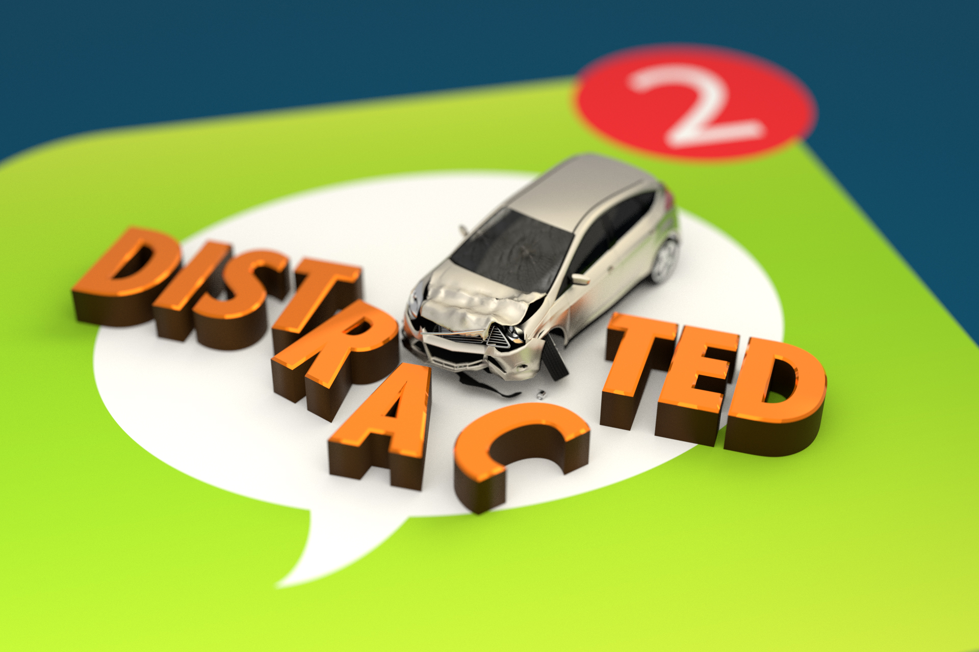 Small car with damage crashed through DISTRACTED letters on top of mobile messaging app icon