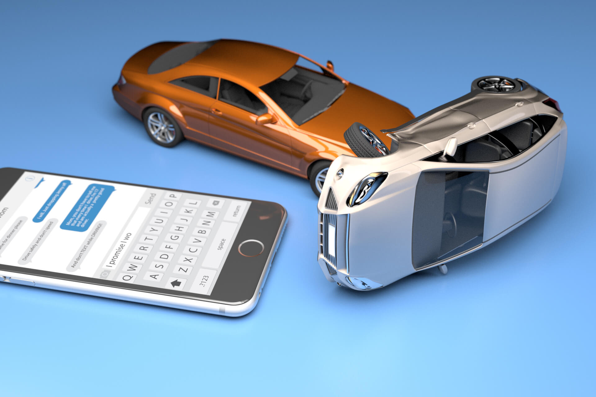 Texting while driving concept image showing two cars crashed next to iphone with messaging app on screen